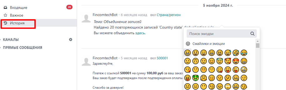 При выборе опции История появится окошко с эмодзи, что позволит вам включить текущий контекст чата.