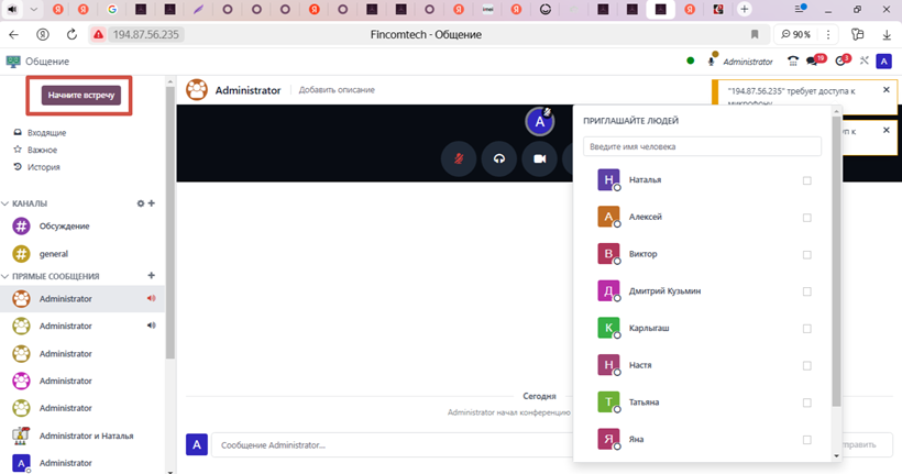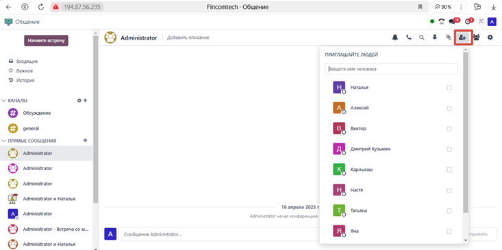 В модуле Общение Встречи — это видеозвонки. Чтобы начать встречу на панели Общение, нажмите Начать встречу в левом верхнем углу и выберите, кого пригласить на встречу, в появившемся раскрывающемся окне Пригласить людей. Чтобы начать встречу из личного сообщения, нажмите значок Начать звонок в правом верхнем углу.