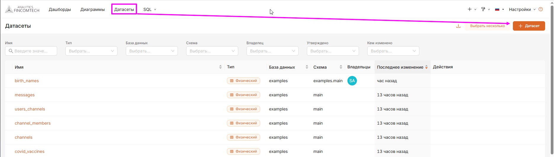 Перейдите в меню Датасет ‣ Датасеты и нажмите кнопку «+Датасет» в правом верхнем углу экрана.