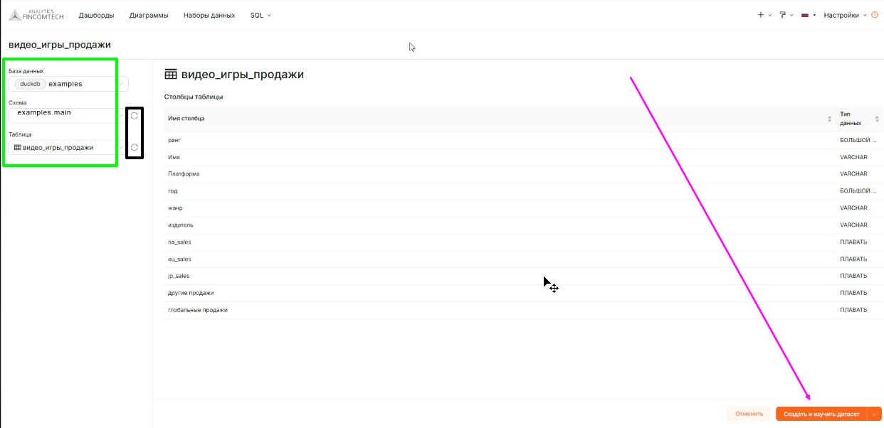 Чтобы завершить процесс, нажмите кнопку Создать и изучить датасет\Создать датасет в правом нижнем углу. С левой стороны(выделено зеленым) необходимо выбрать Базу данных,Схему, и Таблицу.Перед выбором Схемы и Таблицы обновите список схем и таблиц нажав значок с изогнутыми стрелками(выделено черным)