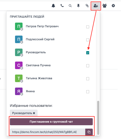 Чтобы добавить пользователей в личный чат, пригласите их, нажав на иконку и поставьте галку напротив нужного имени. После того, как выберете всех пользователей, которых хотите пригласить, прокрутите вниз данного окна и нажмите кнопку Приглашение в групповой чат. В чат можно пригласить по ссылке, которая доступна для копирования под кнопкой Приглашение в групповой чат.
